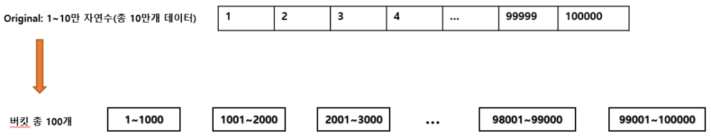 1. 버킷 생성: 데이터를 일정한 크기의 범위로 나눕니다. 이 범위를 버킷이라고 합니다.